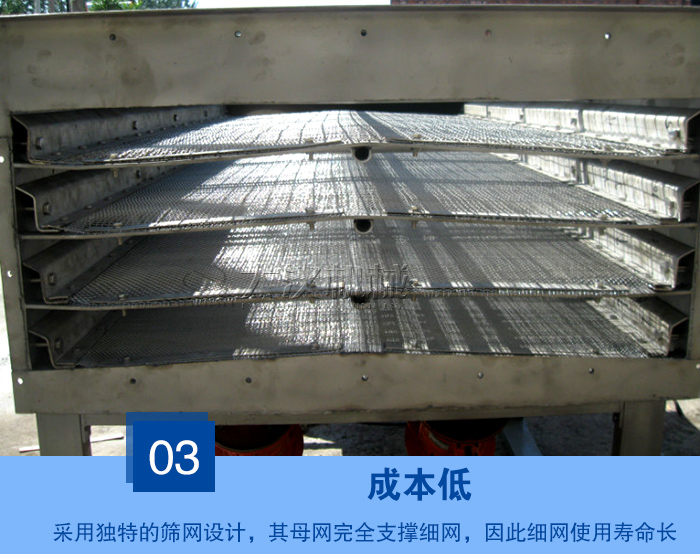 作為為常見的一種振動(dòng)篩,采用獨(dú)特的篩網(wǎng)設(shè)計(jì),其母網(wǎng)完全支撐細(xì)網(wǎng),因此細(xì)網(wǎng)使用壽命長(zhǎng),降低了細(xì)網(wǎng)的耗材使用,長(zhǎng)時(shí)間的生產(chǎn)可降低諸多成本,方便和快速更換篩網(wǎng) 。