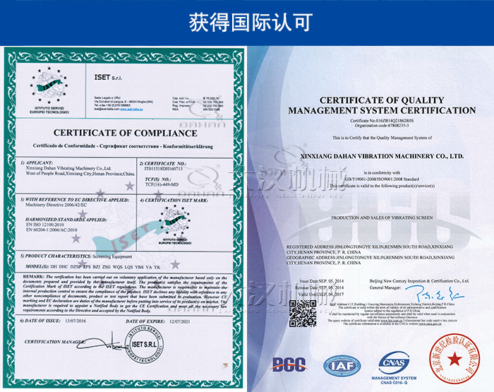 我公司憑借著對質量的高度管控,新鄉(xiāng)大漢直線篩分機質量通過ISO國際質量體系認證和歐盟CE雙認證,用戶無需擔心產(chǎn)品質量問題。