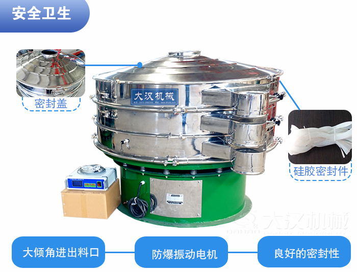 為了保證原材料的衛(wèi)生情況,維生素粉超聲波振動篩要具有良好的密封性,密封件全部采用食品硅膠,網(wǎng)架采用潔凈型粘接網(wǎng)架。減震彈簧部分由不銹鋼圍裙包裹;振動電機可定制為更為安全的防爆振動電機,確保生產(chǎn)安全??紤]到消毒清洗的性和簡便性,超聲波振動篩的出料口、進料口設計需要采用大傾角設計,更利于清洗和消毒。