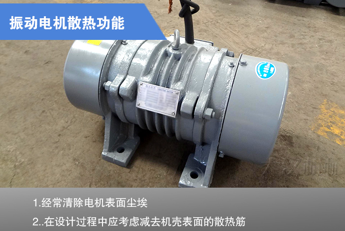 普通電機--端有風扇,工作時使風向順著機殼上面的立筋流動,不僅散熱較快,而且也清除了上面的塵埃,使電機在良好的狀態(tài)下工作。而振動電機因無風扇可散熱,全靠自然冷卻,再加上工作環(huán)境大都非常惡劣,粉塵大,粉塵極易在電機表面堆積,從而引起內(nèi)部溫度過高,燒毀電機。