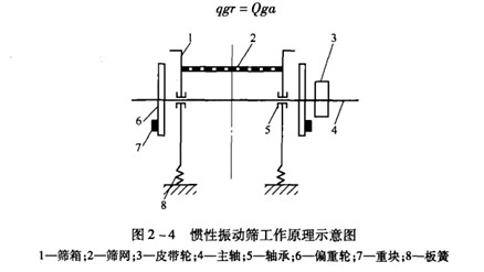 圖2-3和圖2-4分別是sZ型慣性振動(dòng)篩的外形圖和工作原理示意圖。從圖中可以看出,這種篩子有8個(gè)主要組成部分,其中篩網(wǎng)固定在篩箱上,篩箱安裝在兩個(gè)橢圓形板簧上,板繭底座固定在基礎(chǔ)上,偏重輪和皮帶輪安裝在主軸上,重塊安裝在偏重輪上。改變重塊在偏重輪上的位置,可以得到不同的離心慣性力,以此來調(diào)節(jié)篩子的振幅。主軸通過兩個(gè)滾動(dòng)軸承固定在篩箱上。篩箱一般呈15°―25°傾斜安裝,以促進(jìn)物料在篩面上向徘料端運(yùn)動(dòng)。