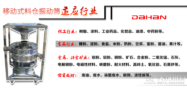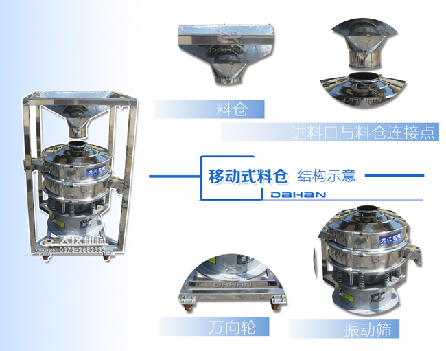 本品大漢公司研制的移動式振動篩料倉一體機(jī),底部加裝可移動式萬向輪,帶進(jìn)料倉,可將物料一次性裝滿料倉,然后通過調(diào)節(jié)料倉上的蝶閥控制物流進(jìn)入振動篩的流量進(jìn)行篩分,本品的特點間歇性加料,不用工人不間斷投料節(jié)省人工,蝶閥控制流量大小能提高篩分精度,同時可將振動篩移動作業(yè),滿足不同地點的工作需要。