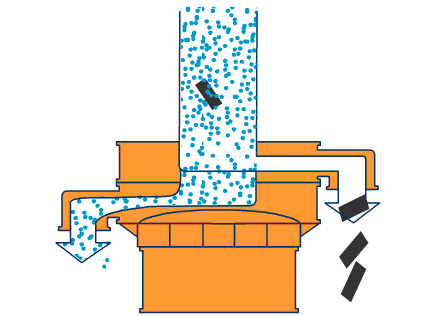 由直立式振動電機(jī)作為激振源,電機(jī)上、下兩端安裝有偏心重錘,將電機(jī)的旋轉(zhuǎn)運(yùn)動轉(zhuǎn)變?yōu)樗健⒋怪?、傾斜的三次元運(yùn)動,再把這個運(yùn)動傳遞給篩面進(jìn)行篩分。調(diào)節(jié)上、下兩端的相位角,可以改變物料在篩面上的運(yùn)動軌跡。