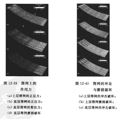 振動(dòng)篩分機(jī)的DEM仿真結(jié)果可以用于分析顆粒群再篩網(wǎng)上的松散度、振動(dòng)強(qiáng)度、料層厚度、篩孔孔徑和篩面傾角等參數(shù)對(duì)分離粒度及篩分效率的影響及相互作用。顆粒群再篩網(wǎng)上的流動(dòng)平衡、顆粒對(duì)篩網(wǎng)的沖擊速度計(jì)施加在篩網(wǎng)上的載荷也能通過(guò)DEM仿真結(jié)果獲得,從而確定篩網(wǎng)所受的應(yīng)力、篩網(wǎng)的磨損及篩分裝置的功率、圖12-39和圖12-40分別為Yuan等人通過(guò)DEM仿真獲得的篩網(wǎng)上的作用力圖和篩網(wǎng)的沖擊與磨損破壞圖。