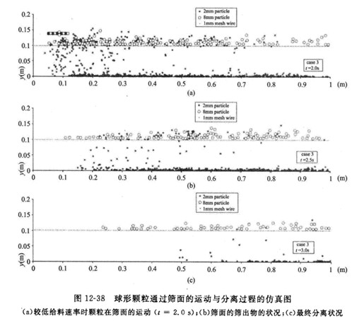 DEM仿真的過(guò)程信息能夠在線不同篩分工作條件下顆粒再篩面的運(yùn)動(dòng)、顆粒同篩面之間的碰撞過(guò)程、顆粒通過(guò)篩網(wǎng)的分離過(guò)程,反映了不同力度顆粒在篩面上運(yùn)動(dòng)形態(tài)的差異,再現(xiàn)不同篩分機(jī)工作條件下顆粒運(yùn)動(dòng)過(guò)程,較為真實(shí)的描述顆粒同篩面之間的碰撞過(guò)程。圖12-38為L(zhǎng)i等人模擬2mm和8mm球形顆粒通過(guò)篩面的運(yùn)動(dòng)與分離過(guò)程圖。